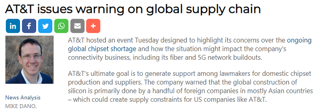AT&T的最終目標(biāo)是獲得立法者對本土芯片組生產(chǎn)和供應(yīng)商的支持。該公司警告稱,硅的全球生產(chǎn)主要是由少數(shù)外國公司在(主要是)亞洲國家完成的,這可能給AT&T這樣的美國公司造成供應(yīng)限制。