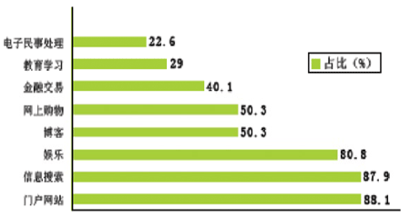 在寬帶內(nèi)容應(yīng)用方面,隨著寬帶接入市場的飽和以及價格的不斷降低,韓國的寬帶運營商積極開辟新的商業(yè)模式,推廣新的增值服務(wù),以提高寬帶收入。在增值服務(wù)內(nèi)容上,韓國寬帶運營商走在了世界同行的前面。該國的網(wǎng)上教育、游戲和視頻點播等寬帶內(nèi)容十分豐富,網(wǎng)上購物、網(wǎng)上銀行交易、網(wǎng)絡(luò)游戲和網(wǎng)絡(luò)廣告等業(yè)務(wù)呈現(xiàn)出較快的增長勢頭。根據(jù)韓國信息通信部的統(tǒng)計報告,截至2007年6月底,使用電子郵件或即時通信軟件的網(wǎng)民占86.9%,與使用網(wǎng)絡(luò)檢索信息的人數(shù)相當(dāng);78.7%的人上網(wǎng)獲取娛樂內(nèi)容,如下載音樂、電影和電子雜志等。具體各項寬帶應(yīng)用使用率如圖3所示: