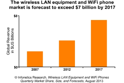 ICCSZ訊 市場(chǎng)調(diào)研公司Infonetics發(fā)布其2013年2季度無(wú)線局域網(wǎng)(Wireless LAN)設(shè)備和無(wú)線電話(WiFi Phones)調(diào)研報(bào)告。