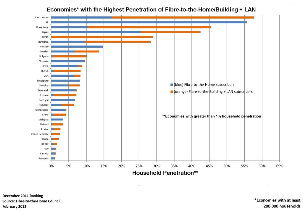 20個(gè)國(guó)家符合標(biāo)準(zhǔn)中的排名(見圖),一個(gè)國(guó)家中的20萬個(gè)家庭必須至少有其中的1%使用FTTH或者FTTB接入光纖網(wǎng)絡(luò)。今年的入圍者沒有新成員。