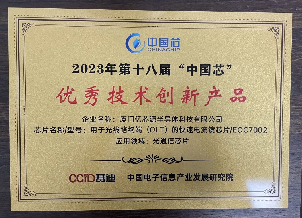 ICC訊 9月20日,由中國(guó)電子信息產(chǎn)業(yè)發(fā)展研究院、橫琴粵澳深度合作區(qū)執(zhí)行委員會(huì)、珠海市人民政府聯(lián)合主辦的2023琴珠澳集成電路產(chǎn)業(yè)促進(jìn)峰會(huì)暨第十八屆“中國(guó)芯”頒獎(jiǎng)儀式在珠海順利召開。本次峰會(huì)聚焦中國(guó)集成電路產(chǎn)業(yè)的前沿成果,廈門億芯源研發(fā)的用于光線路終端(OLT)的快速電流鏡芯片(EOC7002),憑借出色的產(chǎn)品自主創(chuàng)新力在285家企業(yè)的398款參賽芯片產(chǎn)品中脫穎而出,榮獲第十八屆“中國(guó)芯”優(yōu)秀技術(shù)創(chuàng)新產(chǎn)品。