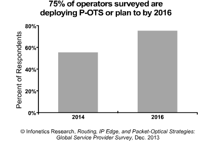 “服務(wù)供應(yīng)商和設(shè)備商們一直在談?wù)撊绾瓮ㄟ^基本分組功能來使用更多的光傳輸以在分組流量中作為替代路由器的傳輸媒介,”Infonetics研究公司共同創(chuàng)始人和運(yùn)營商網(wǎng)絡(luò)領(lǐng)域的首席分析師Michael Howard表示。“我們最新的路由策略(Routing Strategies)研究證實(shí),在運(yùn)營商網(wǎng)絡(luò)中大的變化正在發(fā)生。與我們交談的運(yùn)營商中,75%正在使用或計(jì)劃到2016年使用分組光傳輸系統(tǒng)(P-OTS)。”