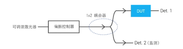 除了DUT的變化函數(shù)外,我們可以看到計算還包括來自用于連接DUT的耦合器(TF1和TF2)以及光纖適配器(TFA和TFB)的項目。通過基準(zhǔn)測量,我們可以消除這些項目的影響。應(yīng)該注意的是,即使在使用經(jīng)過校準(zhǔn)的耦合器時,基準(zhǔn)測量也很有幫助,因為該耦合器的變化函數(shù) 可能隨著時間的變化而變化(如隨著溫度變化)。監(jiān)測功率計(Det.2)用于補(bǔ)償光源在測量期間出現(xiàn)的任何功率波動。