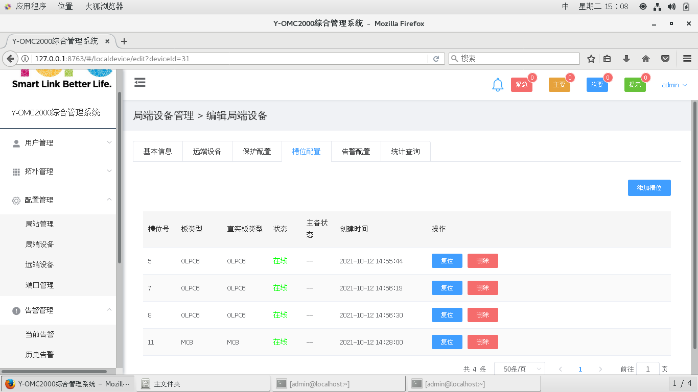 4.1、集中式網(wǎng)管功能測試,測試網(wǎng)元設(shè)備能接入集中化OMC。通過 OMC 可以訪問測試設(shè)備網(wǎng)元,查看設(shè)備面板信息,可正常查看IP/ID、設(shè)備類型、業(yè)務(wù)板卡槽位號和狀態(tài)等等
