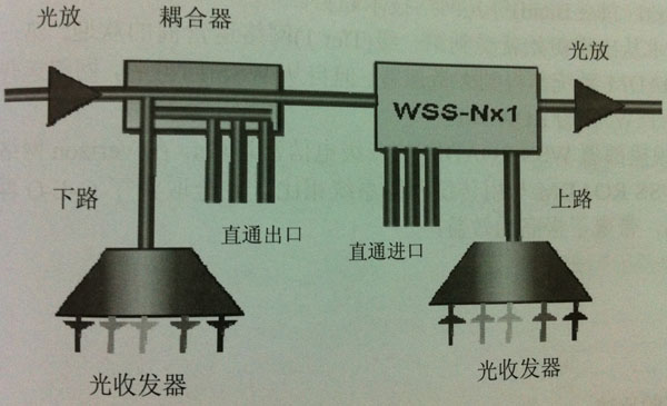 WSS可以在上路側(Nx1 WSS)和下路側(1xN WSS)同時使用。但為了節(jié)省成本,在實際應用上,大部分系統(tǒng)設計成只在上路側使用WSS。圖二給出了典型的WSS ROADM節(jié)點應用(僅顯示了自左向右的方向)。