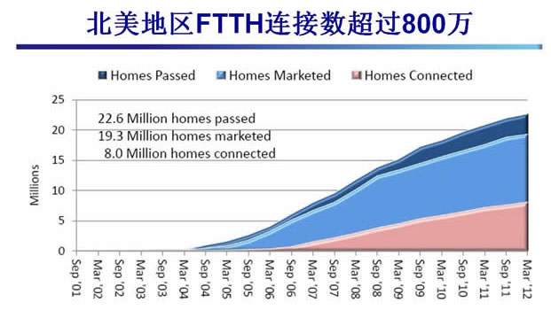 該數(shù)據(jù)來自市場分析公司RVA。該公司表示,自2011年4月以來,橫跨美國、加拿大、墨西哥和加勒比海地區(qū)的90萬戶家庭升級到FTTH服務(wù),使得北美地區(qū)全光纖連接家庭數(shù)大幅增長至超過800萬。數(shù)字表明,在這片大陸上,F(xiàn)TTH家庭覆蓋數(shù)達到2260萬。