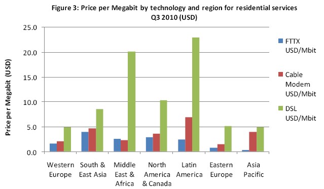 在2007年到2010年9月期間,三種不同的寬帶接入技術(shù)都經(jīng)歷了平均價格的急劇增長。 DSL仍是最便宜的接入技術(shù),其次是FTTx和Cable Modems。如果不計入PPP(購買力平價)影響,Cable Modemns接入價格自2007年底來第一次超過了FTTx,價格上漲主要是由于歐洲及亞洲地區(qū)運(yùn)營商價格上升。