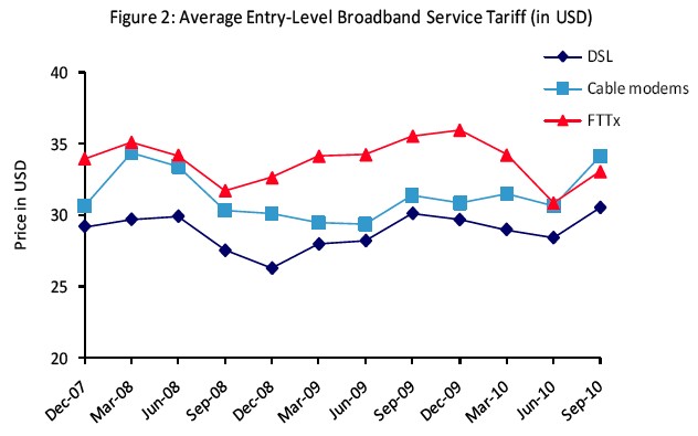 若不計入購買力平價影響, 自2009年12月開始, DSL以及Cable Modem平均價格呈現(xiàn)增長趨勢,但2010年第二季度有所例外,在該季度,兩種接入技術(shù)的寬帶價格都有所下降。