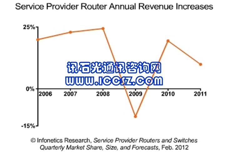 我們可以從運(yùn)營(yíng)商級(jí)路由器市場(chǎng)的近期走勢(shì)來看整體路由器和交換機(jī)市場(chǎng):把2009年經(jīng)濟(jì)衰退器件的高度異常除外,路由器銷售額一直以兩位數(shù)的年增幅增長(zhǎng),直到2011年,其年增幅只有相對(duì)較低的9.9%。
