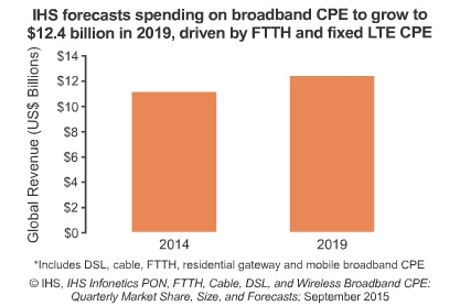 ICCSZ訊 近日市場調(diào)研公司IHS發(fā)布其最新的關(guān)于客戶駐地設(shè)備(CPE)市場報(bào)告,該報(bào)告分析了DSL、線纜、光纖到戶方面的市場信息。IHS預(yù)測該市場到2019年將增長8%,至124億美元。