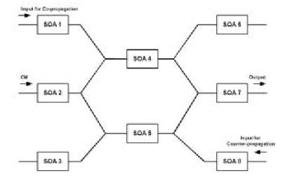 在反向傳輸(counter-propagation)結構中,預放大器會導致信號性能受限,如數據信號的增益受到壓縮以及在預放大器中CW激光器的XGM效應。所有這些問題都可以通過一個帶有干涉儀的SOA-MZI結構來得到解決(通過對輸入臂上的CW進行相消干涉解決)。