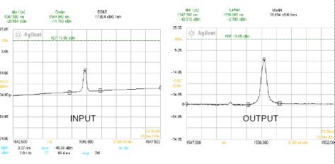 這樣就讓本地CW波長與輸入信號波長在干涉儀上產生了相長干涉(constructive interference),從而導致輸入數據的波長轉換,即從λ2轉變?yōu)棣?。由于本地CW具有很高的光譜純凈度,因此輸出光信噪比(OSNR)將得到有效改善,從一個受噪音影響的低OSNR輸入信號轉變成高信噪比的輸出信號,這樣導致信號的光譜得到再整形,參看圖2。而波長轉換和2R再生這兩項功能則是SOA-MZI的最主要應用。