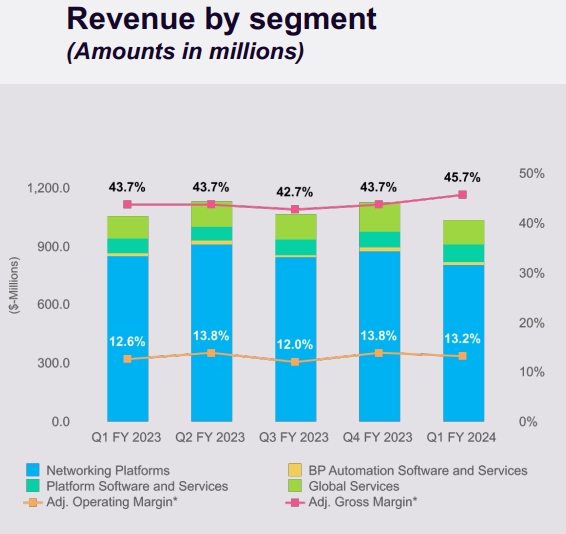 分業(yè)務(wù)部門來看,2024財(cái)年第一季度,來自網(wǎng)絡(luò)平臺(tái)的銷售收入為8.07億美元,同比下滑5.6%,來自平臺(tái)軟件和服務(wù)的銷售收入為8970萬美元,與去年同期的7340萬美元同比增長22.2%,來自全球服務(wù)的銷售收入為1.27億美元,同比增長1%。