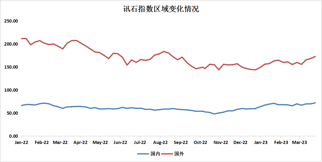 按地區(qū)劃分,截止到3月31日,ICC所統(tǒng)計(jì)的國(guó)內(nèi)通信指數(shù)為72.32,相比2月底的65.89增長(zhǎng)9.76%。算力網(wǎng)絡(luò),數(shù)字經(jīng)濟(jì)發(fā)展迅速,國(guó)內(nèi)股指出現(xiàn)增長(zhǎng)趨勢(shì)。國(guó)外企業(yè)通信指數(shù)整體呈現(xiàn)增長(zhǎng)趨勢(shì)。由2月底的155.32增長(zhǎng)到3月底的172.91。國(guó)外通信股指較上月增長(zhǎng)11.18%。