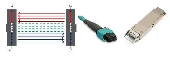 此應(yīng)用模型符合新的標(biāo)準(zhǔn)IEEE802.3bm,該標(biāo)準(zhǔn)已經(jīng)于2015年正式發(fā)布。采用8芯多模光纖組成的4個(gè)通道并行傳輸。多模OM3與OM4光纖均支持100G應(yīng)用,接口采用12芯MPO接口,其中中間4四芯光纖不啟用,每個(gè)通道支持25G,傳輸模型與IEEE802.3ba中40GBase-SR4完全一致,收發(fā)器采用QSFP28,具體通道與接口如下圖3所示: