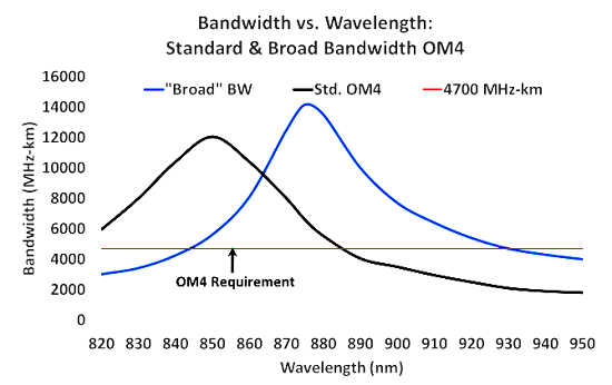 傳統(tǒng)OM3及OM4的多模光纖的主要傳輸窗口定義在850nm, 而如果采用SWDM技術(shù)則需要有四個(gè)窗口傳輸光信號(hào),四個(gè)波段光源仍采用性價(jià)比高的VCSEL垂直腔面發(fā)射激光器。為了提高整體的帶寬,新一代多模光纖WBMMF(Wideband Multimode Fiber)的帶寬將有了新的提升,帶寬性能最高點(diǎn)處于大約在880nm波段附近且最高帶寬點(diǎn)高于傳統(tǒng)OM4多模光纖,參考下圖5關(guān)于傳統(tǒng)多模OM4光纖與WBMMF光纖的帶寬對(duì)比圖。