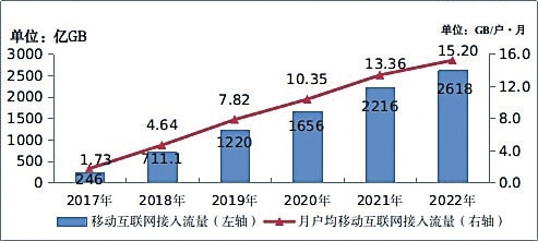 2022年,移動互聯(lián)網(wǎng)接入流量達2618億GB,比上年增長18.1%。全年移動互聯(lián)網(wǎng)月戶均流量(DOU)達15.2GB/戶·月,比上年增長13.8%;12月當(dāng)月DOU達16.18GB/戶,較上年底提高1.46GB/戶。