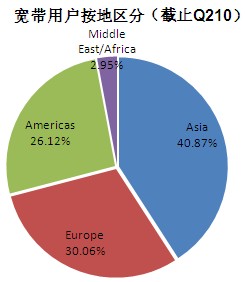 "北美地區(qū)住房刺激計劃的結束對寬帶造成不利影響。然而 2010 年第二季度所有其他地區(qū)表現同比 2009 年均有好轉。"Point Topic 首席執(zhí)行官 Oliver Johnson 說道。 持續(xù)之前的季度數據所顯示的趨勢,2009 年第二季度到 2010 年第二季度這一年中,亞洲在整個寬帶市場中所占的份額進一步提高 1.2% ,僅上一個季度就提高了 0.41% 。目前該地區(qū)約占整體份額 41%,歐洲占 30% 份額位列第二,美洲份額為 26% 。中國(包括香港和澳門)是亞洲寬帶增長率中貢獻最大的一個國家,新增寬帶線路 5,470,888 條,總數量達 120,591,488 條,在第三季度早期達到的 500,000,000 條寬帶線路中占比超過 24% 。
