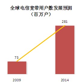預(yù)計(jì)到2014年底,寬帶電信服務(wù)的年增速高達(dá)31%,全球用戶數(shù)量從2009年的7,300萬驟增至2014年的 2.81億。而同期ADSL用戶數(shù)量的年增幅預(yù)計(jì)為8.4%。而在2014年,ADSL仍將以4.58億用戶繼續(xù)保持領(lǐng)先。