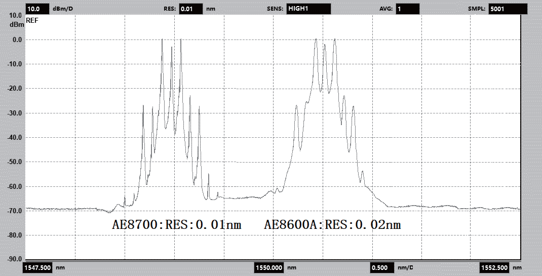 高速調(diào)制光測(cè)試,優(yōu)于10pm高波長(zhǎng)分辨率,能夠分辨清楚光譜細(xì)節(jié),有利于DWDM高速調(diào)制信號(hào)測(cè)量.