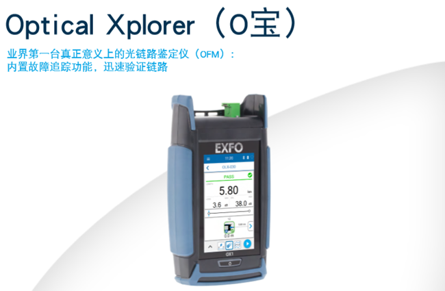 因此,針對5G時(shí)代的新挑戰(zhàn),怎樣的光纖測試工具才能適應(yīng)新時(shí)代需求?唐杰斌認(rèn)為客戶始終需要一種能確保鏈路安全,積極的響應(yīng)服務(wù)和快速識別及處理任何疑難扎掙的測試方式,EXFO公司為此推出了Optical Xplorer?(O寶),它是業(yè)界第一臺真正意義上的光鏈路鑒定儀(OFM)。