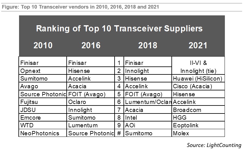 ICC訊 5月底,光通信行業(yè)知名市場(chǎng)調(diào)研機(jī)構(gòu)LightCounting發(fā)布最新一期的市場(chǎng)報(bào)告,并更新了全球光模塊供應(yīng)商TOP10排名情況。根據(jù)報(bào)告,中國(guó)廠商表現(xiàn)出色,Innolignt旭創(chuàng)科技位居第1,華為(海思)排名第3,Hisense海信寬帶排名第5,Eoptolink新易盛排名第7,Accelink光迅科技排名第8。