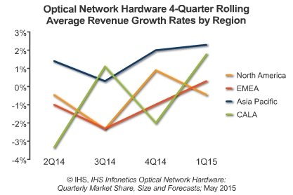 ICCSZ訊(編譯:Nina)IHS研究報告指出,Q115全球光網(wǎng)絡硬件開支同比增長5%,一方面是由于EMEA市場持續(xù)改善,另一方面日本市場開始大規(guī)模100G部署。