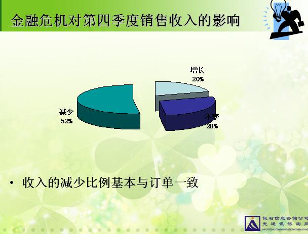 在訊石十一月“金融風(fēng)暴專題”聯(lián)誼會中,我們針對“金融危機對光通訊行業(yè)的影響”這一主題進行了一個問卷調(diào)查,共有30多家企業(yè)的70多名來賓朋友接受了此次問卷調(diào)查。調(diào)查結(jié)果顯示:金融危機下,超過一半以上的企業(yè)訂單及收入都有所減少,但受影響程度并不大,所以企業(yè)目前關(guān)于生產(chǎn)及人事方面的計劃亦沒有發(fā)生很大變化。以下是問卷調(diào)查結(jié)果分析。