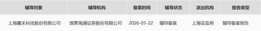 ICC訊 2026年1月23日,證監(jiān)會(huì)官網(wǎng)IPO輔導(dǎo)公示系統(tǒng)顯示,上海羲禾科技股份有限公司(簡(jiǎn)稱(chēng)“羲禾科技”)向上海證監(jiān)局提交IPO輔導(dǎo)備案,輔導(dǎo)券商為國(guó)泰海通。