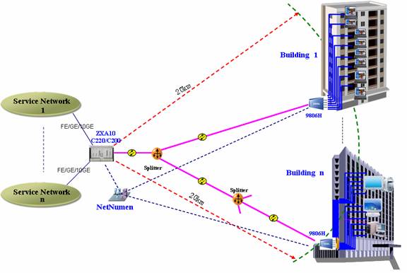 在FTTB方式下,ZXDSL 9806H作為MDU,向上通過Splitter和局端設(shè)備OLT相連,ZXDSL 9806H可以放在大樓的地下室,過道或者樓外機(jī)柜作為室外型設(shè)備使用,在樓內(nèi)保持原有的雙絞線資源并加以充分利用,對于比較高的樓層,可以通過在一定高度增加分線盒的方式以增加布線和工程的方便性。