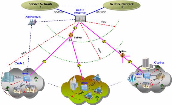 在FTTC和FTTCab模式下,采用ZXDSL 9806H來進(jìn)行用戶差異化區(qū)別覆蓋,如1km或500米半徑范圍內(nèi)提供不同帶寬,OLT和MDU的距離最遠(yuǎn)可以達(dá)到20km。由于ZXDSL 9806H具備室外安裝條件,可以放在小區(qū)的綠化帶里或者壁掛在桿上以節(jié)省網(wǎng)絡(luò)建設(shè)成本。
