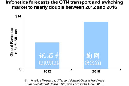 【訊石光通訊咨詢網(wǎng)】來自Infonetics的研究顯示,盡管目前OTN交換在整體OTN市場中的占比較小,并且主要是中國市場在部署,但該公司預(yù)計隨著EMEA和北美地區(qū)運營商在其區(qū)域和核心網(wǎng)絡(luò)中采用集成WDM+OTN交換以作為部署100G相干技術(shù)的一部分,OTN交換市場將迎來突破性的增長。Infonetics預(yù)計從2012年到2016年間,全球OTN交換細(xì)分市場將以28%的年均復(fù)合增長率增長。