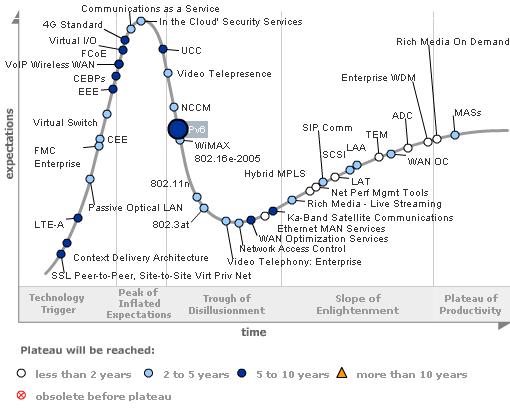 *此圖表為 Gartner2009 年發(fā)布的對于電信行業(yè)技術的評估曲線. 其中對于IPv6 做了標準.