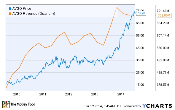 從去年Avago的銷售收入開始擴(kuò)張開始,Avago的股價幾乎翻了一倍。股價的增長不全是對Avago良好表現(xiàn)的理性回應(yīng),部分反映出投資者對一家快速增長公司的熱情。