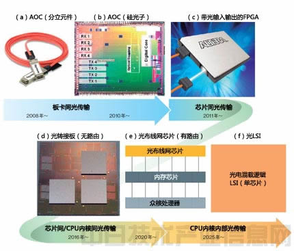 圖1:光傳輸?shù)膽?yīng)用范圍將從板卡間擴(kuò)大到芯片間,再到芯片內(nèi)。