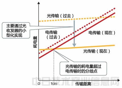 如果傳輸距離在1cm以上,目前的光傳輸技術(shù)的耗電量小于電傳輸。光傳輸?shù)暮碾娏恐饕枪馐瞻l(fā)器的電光轉(zhuǎn)換以及光電轉(zhuǎn)換消耗的。最近大幅減小了光收發(fā)器的尺寸,因此耗電量也減小了。