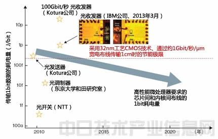 比如,2013年3月IBM利用硅光子技術(shù)開(kāi)發(fā)出了耗電量為1pJ/bit的光收發(fā)器IC。預(yù)計(jì)電傳輸?shù)淖畹秃碾娏吭趥鬏斁嚯x為1cm時(shí)約為150fJ(0.15pJ)/bit(圖3)1)。雖然還有好幾倍的差距,但如果只限于光傳輸?shù)母黜?xiàng)功能,耗電量比IBM的試制品小2、3位數(shù)的技術(shù)也已開(kāi)發(fā)出來(lái)。