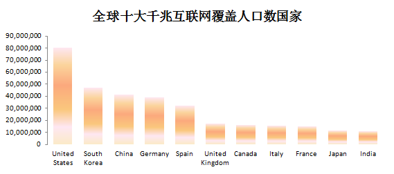 分國家來看,美國仍然是千兆互聯(lián)網(wǎng)人口覆蓋數(shù)最多的國家,現(xiàn)有超過8048萬人可以連接千兆寬帶。其次是韓國的4692萬,中國的4125萬、德國的3882萬和西班牙的3245萬。目前覆蓋人口數(shù)上千萬的國家有11個。除了前五大之外,還有英國、加拿大、意大利、法國、日本和印度。