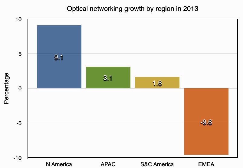 相比之下,在EMEA地區(qū),2013年光網(wǎng)絡(luò)市場則萎縮了近10%。由于在歐洲沒有相應(yīng)費用的開支,是導(dǎo)致EMEA地區(qū)市場下降的主要原因。
