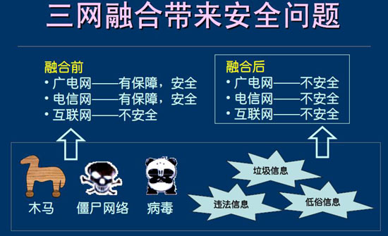 不過,趙梓森還指出,三網(wǎng)融合在帶動經(jīng)濟(jì)發(fā)展的同時也帶來安全問題。三網(wǎng)融合能把人們的生活、工作、娛樂方式相互融合,讓手機(jī)、電視、計算機(jī)成為可以隨時切換的顯示屏,讓虛擬的網(wǎng)絡(luò)世界在現(xiàn)實世界中與用戶隨行……但是就三種獨立的網(wǎng)絡(luò)載體來看,目前的互聯(lián)網(wǎng)本身存在了太多的不安全信息,比如木馬、僵尸網(wǎng)絡(luò)、病毒等,而廣電網(wǎng)和電信網(wǎng)并不存在這些危害信息,在實現(xiàn)三網(wǎng)合一后,互聯(lián)網(wǎng)將攜帶這些低俗違法的垃圾信息進(jìn)入廣電網(wǎng)和電信網(wǎng),這將給三網(wǎng)融合安全隱患帶來極大的威脅。趙梓森因此表示,面對三網(wǎng)融合,我們需要加強監(jiān)控體系與信任體系的建設(shè)比重,加強對整體安全態(tài)勢感知的力度,同時建立應(yīng)急保障體系,才能促進(jìn)這個產(chǎn)業(yè)的長久穩(wěn)定發(fā)展。