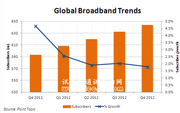 【訊石光通訊咨詢網(wǎng)】Point Topic最新統(tǒng)計(jì)數(shù)據(jù)顯示,截止2012年12月底,全球固網(wǎng)寬帶用戶達(dá)到6.438億。隨著許多國家轉(zhuǎn)移到挽回流失客戶而非開發(fā)新客戶,全球固網(wǎng)寬帶用戶增勢放緩。實(shí)際上,2012年全球固網(wǎng)寬帶用戶的增速僅僅只有2008年的一半。Point Topic表示增長放緩的原因還包括,有跡象表現(xiàn)經(jīng)濟(jì)因素制約著新的和新興市場寬帶用戶的增長。