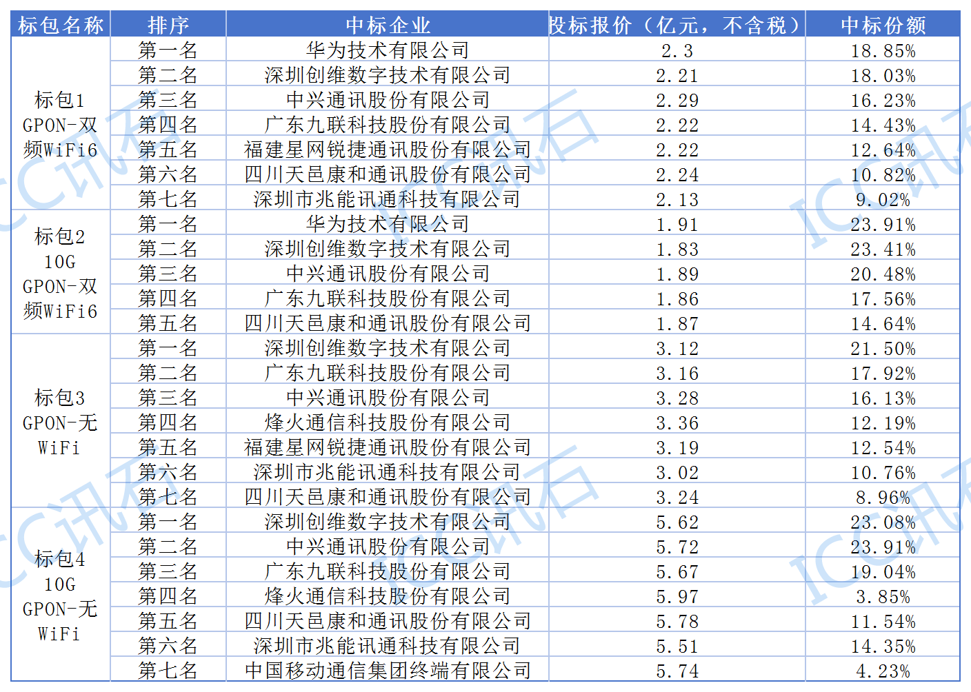 標(biāo)包1,GPON 雙頻WiFi6,7家中標(biāo),約2.2億元;標(biāo)包2,10GPON 雙頻WiFi6,5家中標(biāo),約1.9億元;標(biāo)包3,GPON 無WiFi,7家中標(biāo),約3.2億元;標(biāo)包4,10GPON 無WiFi,7家中標(biāo),約5.7億元。具體中標(biāo)結(jié)果如表所示: