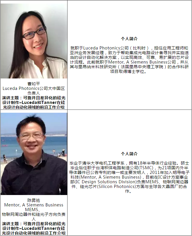 專家:曹如平(Luceda Photonics公司大中國區(qū)負責人)、陳昇祐(Mentor, A Siemens Business MEMS、物聯(lián)網(wǎng)周邊器件和硅光子方向負責人)