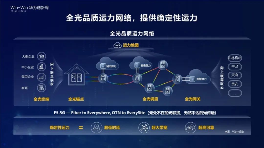 在F5.5G時代,確定性的運力包含超大帶寬、超低時延及超高可靠三大特征,與算力深度融合才能應對海量用戶的上云和算力需求。靳玉志指出,華為全光品質(zhì)運力網(wǎng)絡,向下聯(lián)接企業(yè)和家庭,向上聯(lián)接云和算力,支撐運營商的網(wǎng)絡建設和業(yè)務發(fā)展,其中包含全光錨點、全光終端、全光調(diào)度、全光網(wǎng)關、運力地圖五大創(chuàng)新方案。