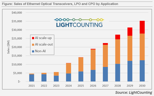 報(bào)告中的圖表展示了以太網(wǎng)光模塊(含重定時(shí)模塊、線性驅(qū)動(dòng)可插拔LPO及共封裝光學(xué)CPO)的最新銷售預(yù)測。數(shù)據(jù)顯示,2023-2025年AI相關(guān)光學(xué)器件銷售呈現(xiàn)強(qiáng)勁增長。2026-2030年,AI擴(kuò)展網(wǎng)絡(luò)中光連接的應(yīng)用將進(jìn)一步推動(dòng)市場發(fā)展。CPO因更高的帶寬密度和可靠性,預(yù)計(jì)將成為擴(kuò)展網(wǎng)絡(luò)(Scale-up)連接的最佳選擇。