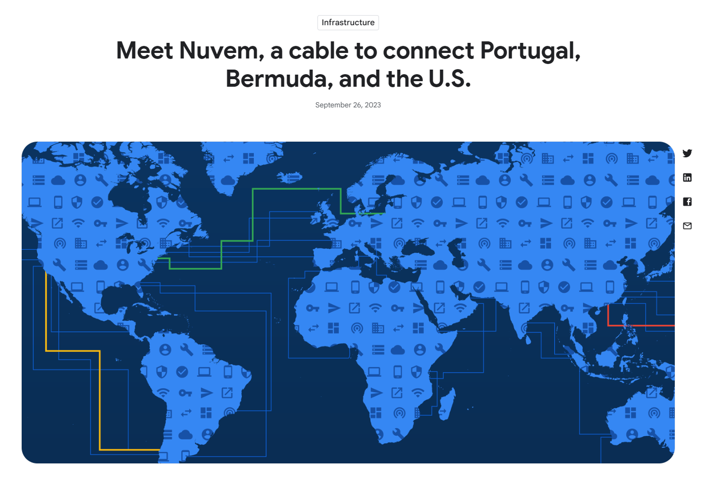 谷歌今日宣布了一項(xiàng)名為 Nuvem 的計(jì)劃,這是一個(gè)連接葡萄牙、百慕大和美國(guó)的新型跨大西洋海底光纜系統(tǒng)。