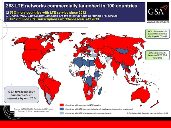 ICCSZ訊 近日,GSA(全球移動設(shè)備供應(yīng)商協(xié)會)確認(rèn)截至2014年2月5號,在全球100個國家已經(jīng)有268個LTE商用網(wǎng)絡(luò)被推出,相比2012年LTE商用網(wǎng)絡(luò)國家的數(shù)量增長了56%。