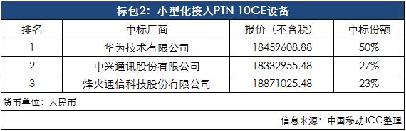 ICC訊 10月28日,中國移動發(fā)布2022年至2023年小型化接入PTN設備集中采購(標包2)的中標結果,華為、中興通訊和烽火通信3家中標。