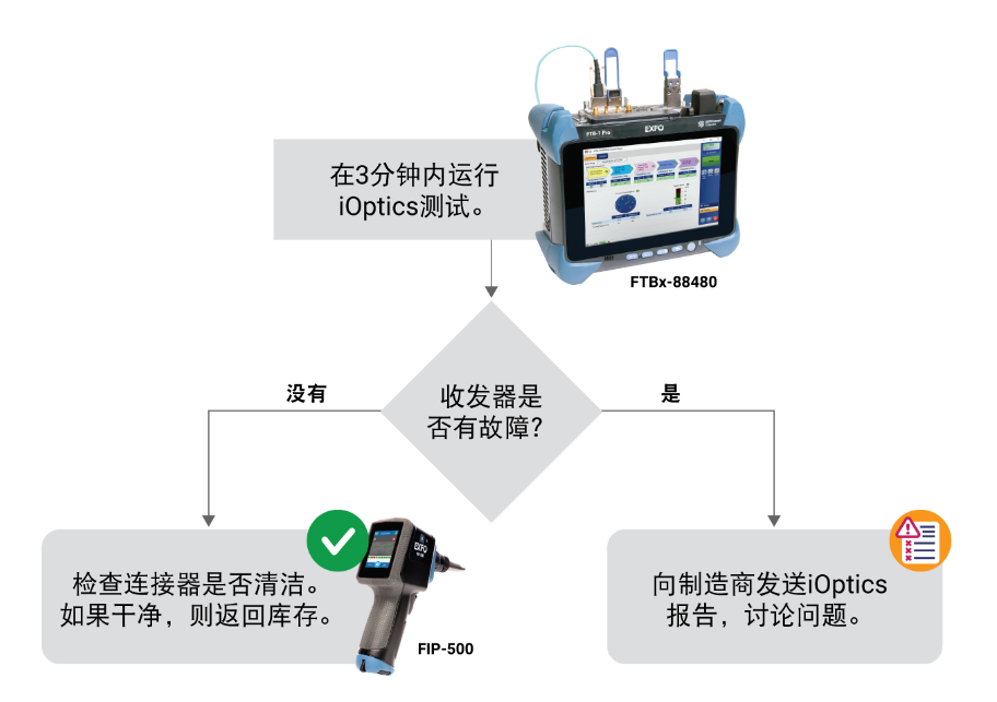 當(dāng)發(fā)現(xiàn)收發(fā)器有缺陷時(shí),iOptics 會(huì)生成一份詳細(xì)的報(bào)告,用于與收發(fā)器制造商和供應(yīng)商討論問題。另一方面,如果被測收發(fā)器狀況良好,則可檢查連接器的清潔度,然后將收發(fā)器歸還庫存,供今后使用,從而節(jié)省資金并減少環(huán)境浪費(fèi)。