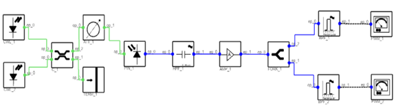 關(guān)于線性度,利用pLogic搭建鏈路如下圖所示,使用兩個(gè)連續(xù)激光器(CWL_1、CWL_ 2)作為光源發(fā)射到2x2定向耦合器(C_1)中。為了產(chǎn)生拍頻,在兩個(gè)連續(xù)激光器之間施加一點(diǎn)頻率差。通過(guò)C_1后,光衰減器(ATT_1)用于衰減光功率。Pin光電檢測(cè)器(Pin_1)用于檢測(cè)接收信號(hào)并將信號(hào)類型從光信號(hào)轉(zhuǎn)換為電信號(hào)(O-E轉(zhuǎn)換)。DC塊(HPF_1)用于濾除低頻噪聲。電放大器(AMP_1)用于增強(qiáng)光功率并產(chǎn)生一階/三階非線性效應(yīng)。電叉(fork_1)用于將信號(hào)從一個(gè)端口分離到兩個(gè)端口。最后,使用兩個(gè)矩形帶通濾波器(BPF_1、BPF_ 2)分別濾除一階和三階信號(hào)。兩個(gè)功率表(PWM_1、PWM_2)用于測(cè)量電功率。